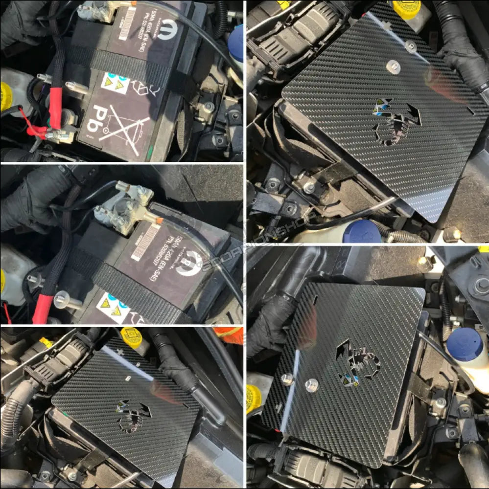 A high-quality cover made of real carbon fiber, with stainless steel mounting parts, for the starter battery.